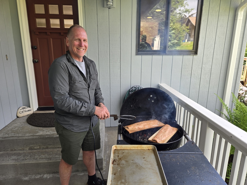 We had showers and settled into what could only be called an absolutely amazing feast. To call it dinner would not do the cheese plate, bruschetta, bbq’d salmon, homemade sourdough bread, oven roasted potatoes, asparagus, fresh salad and homemade blackberry pie al la mode justice. We were treated like royalty. Thanks guys, we are not worthy!