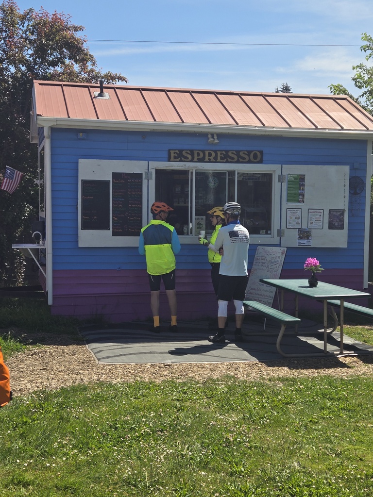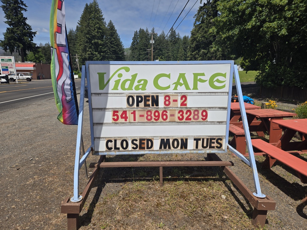 We had about 25 miles to ride to reach our lunch stop but stopped for coffee at 20 miles. This may not have made sense except that we are working hard to get into “trip mode” and Nancy spotted a good looking coffee stand. Stopping had to be done, the coffees were great and everyone got a little more chilled. We stopped 5 miles later for lunch in Vida, at the Vida Café. There will be days on this trip when we are sitting on the side of the road in dirt eating peanut butter and jelly. But today we had a proper lunch. They put on a nice spread.