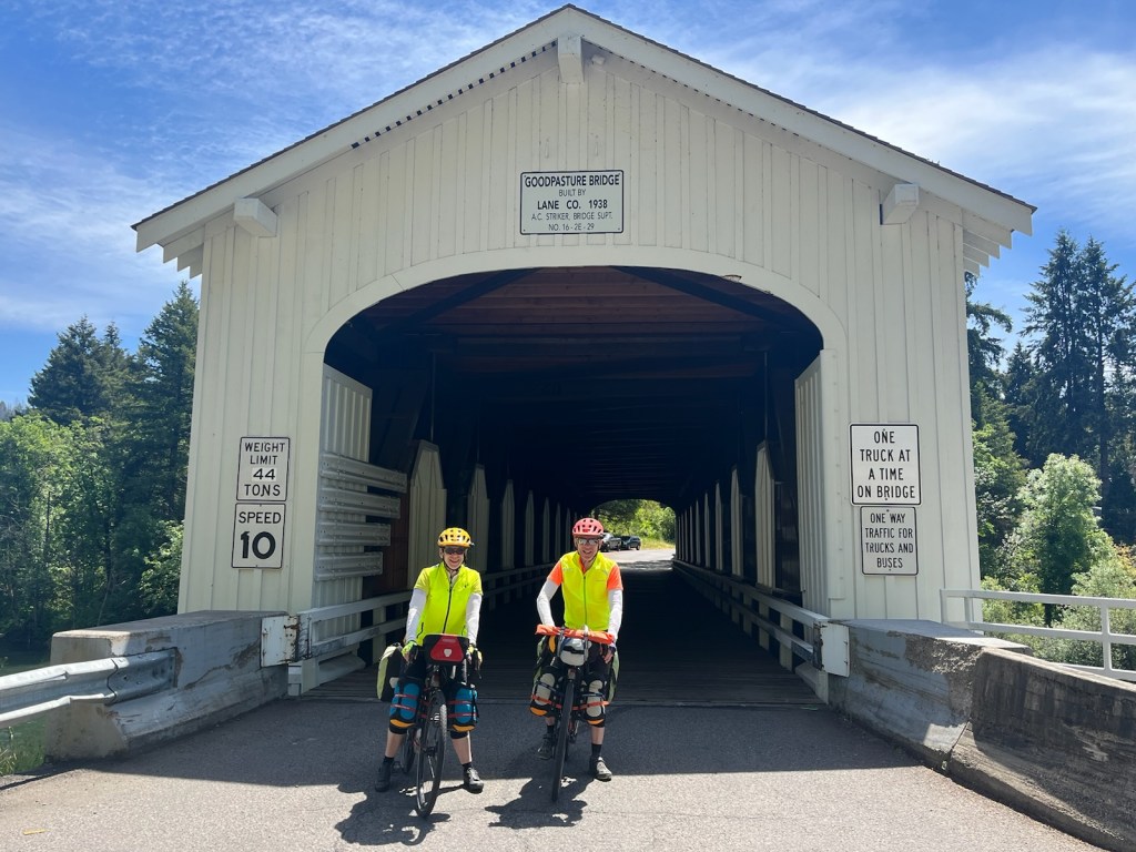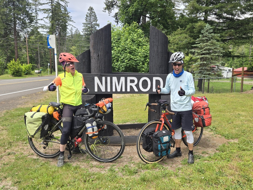 After lunch the tailwind increased, the traffic died down and the shoulder got wider. It really was a lovely ride up the McKenzie River. We stopped at a famous covered bridge for photos. I took a picture there in 1993 of Pete and Inge – Pete recreated it today with Nancy and I. We later stopped for photos in the town of Nimrod to recreate another photo of Pete and I from 1993. “Still in 4th grade”, or something to that affect was all Nancy offered.
