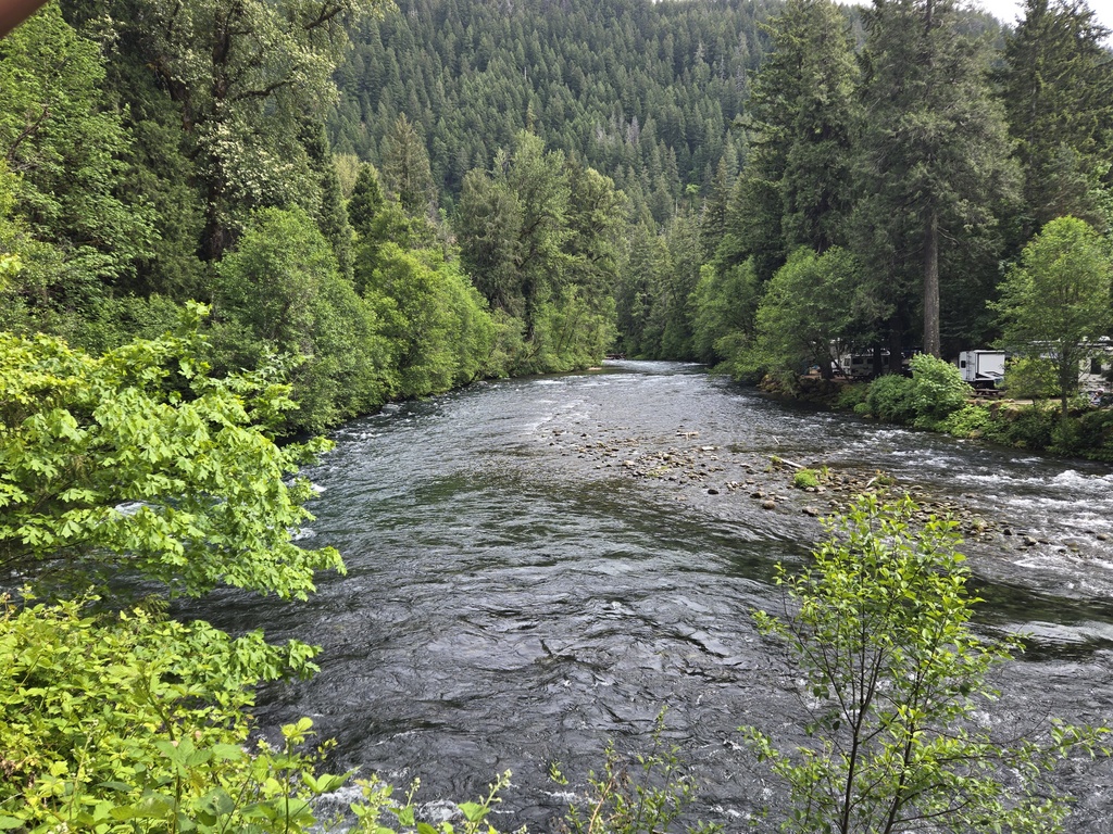 We carried on to the McKenzie Bridge store for supplies, a cold drink and one more photo recreation. Nancy and I took a snap at the mailbox at the store. We have the same photo from 1992. The guy running the store told me a tale of how the mail box was almost removed during a Trump era push to streamline the USPS. The locals were outraged, the mailbox saved and we got our photo.  The old grocery store is now a rather fancy café with a few higher-priced fancier items, so times have really changed since we last passed through.  They did have some nice beers though, so we got one to have later in camp.