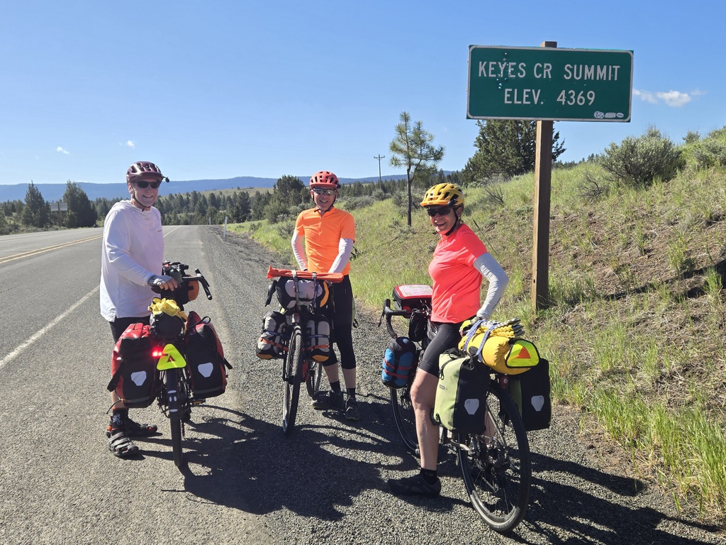 After oatmeal in camp, we were rolling by 8:20. The team is getting significantly better at packing the morning. It helps that the sun is up at 5AM and there were lots of picnic tables in the Mitchell park. Right out of the gate we had solid climb. In fact, Nancy turned on her cycle computer and it flashed the climb ahead warning signal. It was 6 mile climb up to Keyes Creek Summit.