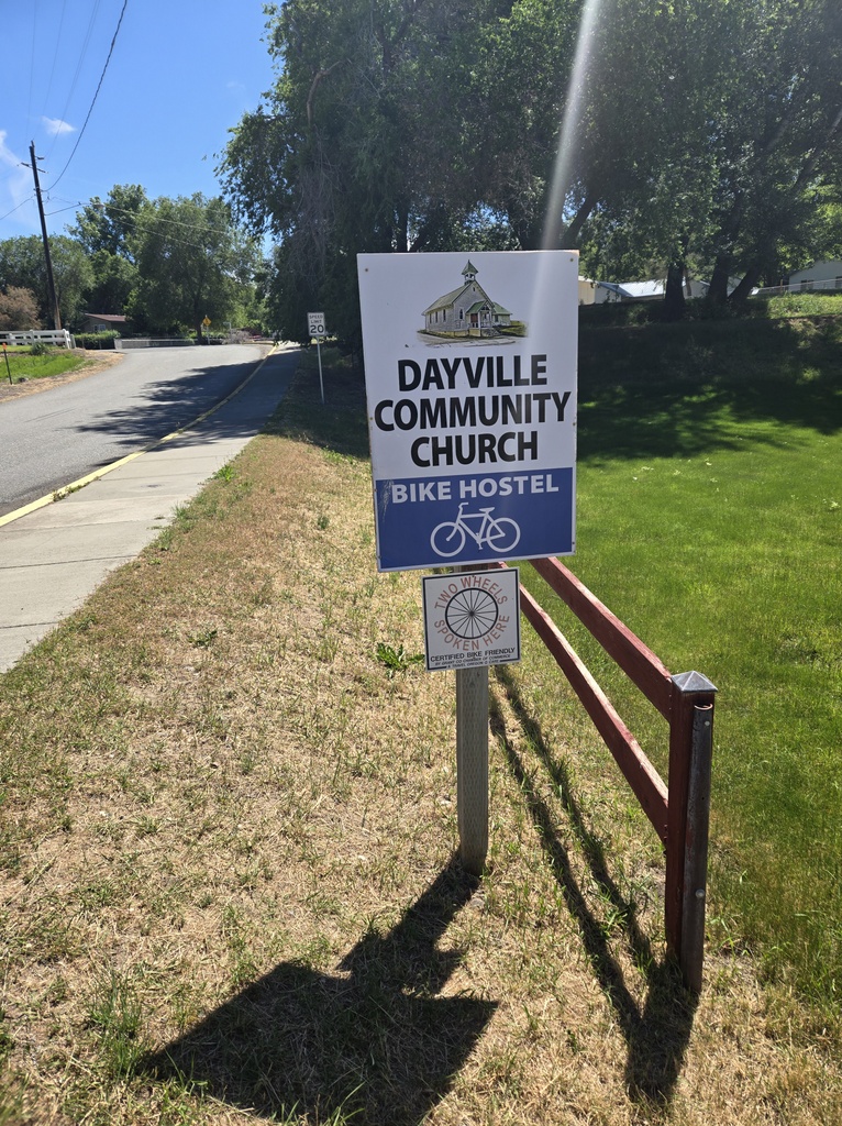 After sandwiches and pie at the Dayville Café we made our way to the Dayville Community Church where they have set up a bicyclist hostel. Nancy found them through the Warmshowers organization and had been in contact with the host. The hosts are out of town but they left the doors open for us and we let ourselves in. They have a great set-up for cyclists – showers, laundry, full kitchen, A/C, lots of room to sleep and naturally a well stocked pantry. Arriving early has almost made today feel like a rest day, right Chris?