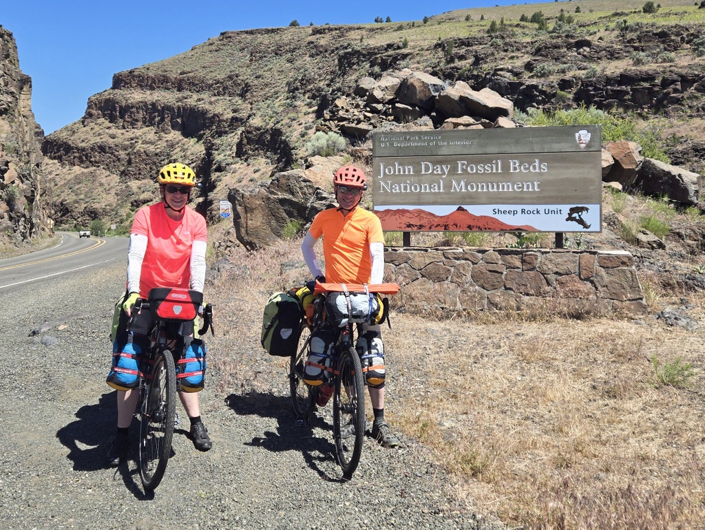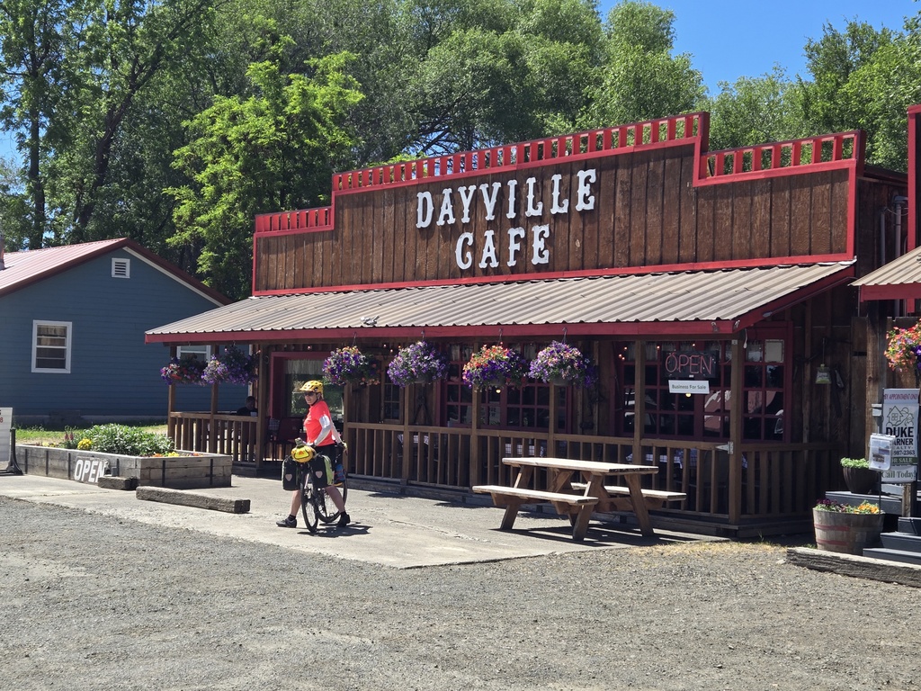 We regrouped at the turn off to the John Day National Monument visitor center. Everyone debated whether it was worth riding the 2 miles out and back for a look. In the end, only Pete and Curtis decided that the extra mileage was worth it. Nancy, Chris and I rode on to the Dayville Café for an early lunch and a pie. Just about when I started feeling guilty for not “smelling the flowers”, Pete and Curtis rolled in and reported that the center was closed today – dang for them.