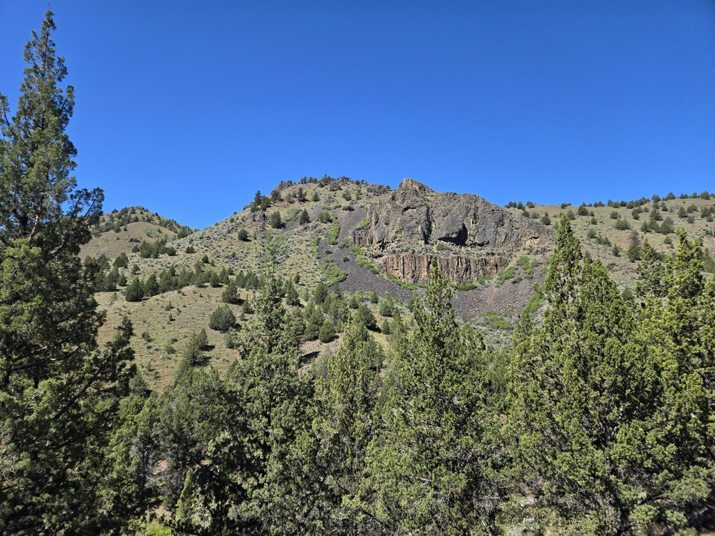 The ride off of Keyes Creek was nowhere near as fast as yesterday’s master blaster off Ochoco Summit. Our friend the tailwind was not as strong today. What it lacked in speed, it more than made up in scenery. The hills are all very green this time of year. We scooted through a couple narrow rock canyons and had some nice escarpment views.