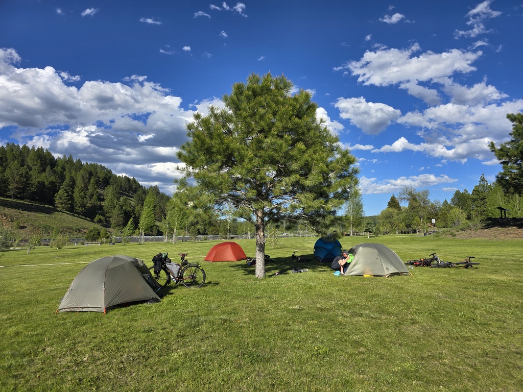 The camp is nice but there are no showers. They have tens of sprinklers running and lots of nice grass. We agree to snap up a campsite for $11. They have hiker biker sites but they are $8 per person. Figure that out – 5 bikers at the hiker/biker site for $40 OR $11 for the five of us in one normal site. Only 2 of the 28 other sites were occupied. We took advantage of a sprinkler at the very far end of the camp for cold cowboy showers, which was really a treat.