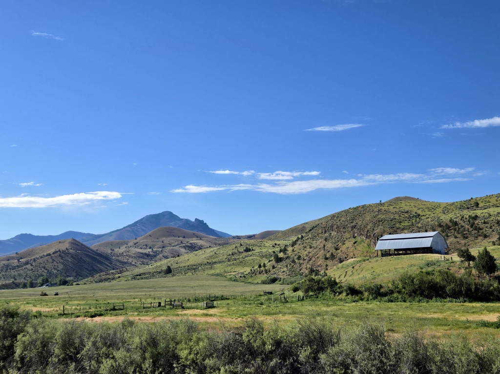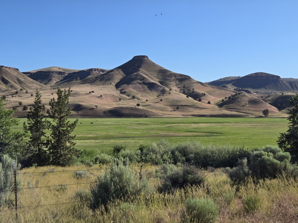 We broke “church” a little before 8AM and had a very nice morning ride through the John Day River Valley. All the hills and fields are stunningly green and made for a number of nice photo ops. The Strawberry Mountains, with their tops still covered in snow, were showing off for most of the day.