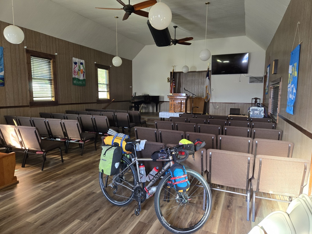 As for today, none of us slept great in the church – there was general agreement that a sleeping pad works better on grass than it does linoleum. Naturally John was up early and true to form, he took the hard floor in a positive light. Thanks again to the good folks of the Dayville Community Church for hosting us.