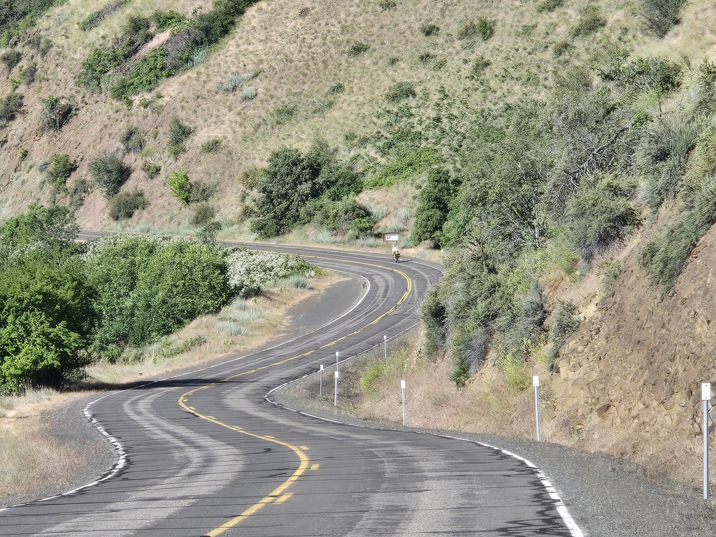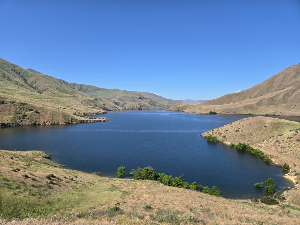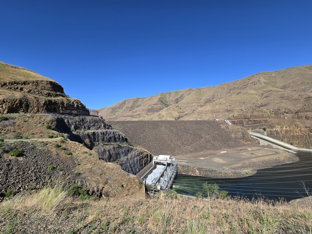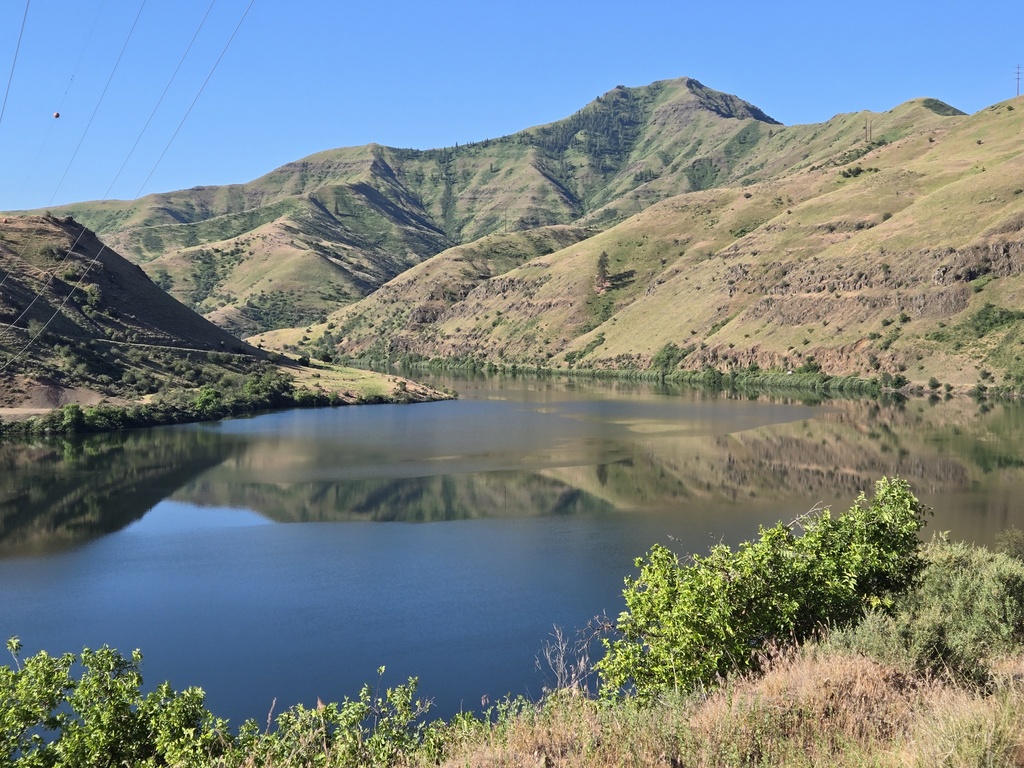 The first 16 miles we rode along the Snake River and two of its reservoirs, the Oxbow and Brownlee Reservoirs. We had the pleasure of climbing up to Oxbow and Brownlee dams, plus a couple more steep pitches. All four of these climbs barely registered on the profile today, because of the big climb up Brownlee Summit. At the bottom of Brownlee Dam we crossed into Idaho for good. I snapped a photo but it was a remarkably bad photo.