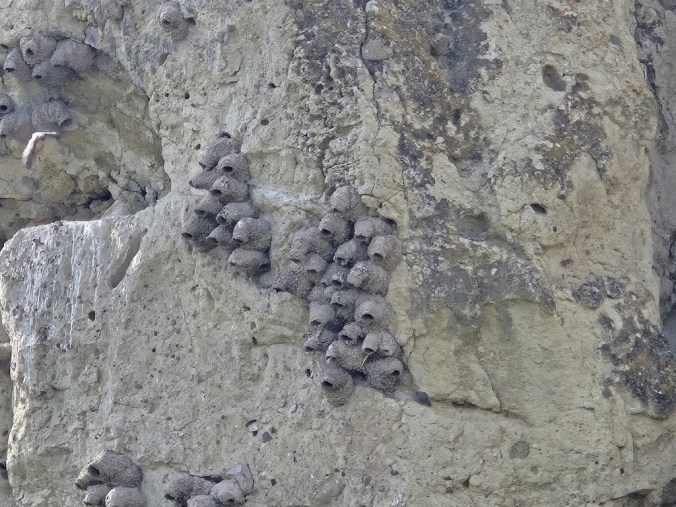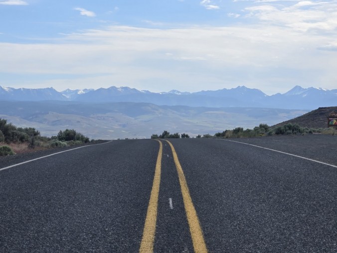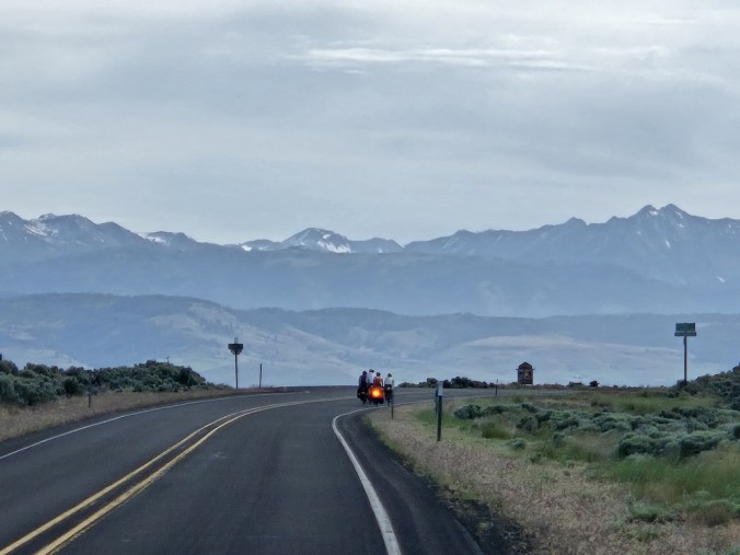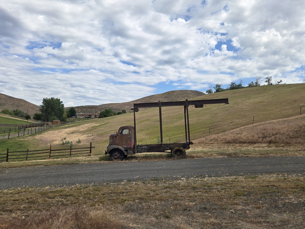 We had a small climb out of town, and considered riding up the steep hill to the Oregon Trail Interpretive Center outside of town but knowing it was closed swayed everyone to just look at it from road.  We had some beautiful views of the mountain ranges outside of Baker City, many of them still dusted with snow. We rode alongside the Powder River for awhile, but then had to climb away from it on the way to Richland.  Our first real climb wasn’t too bad, and we had some cloud cover to help moderate the heat.