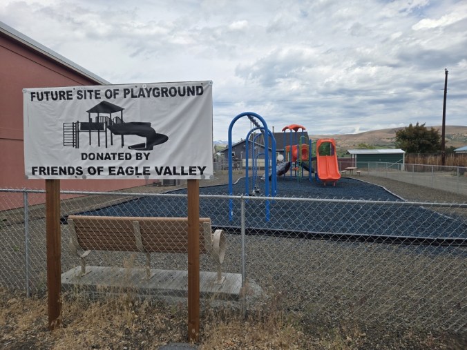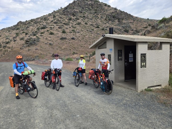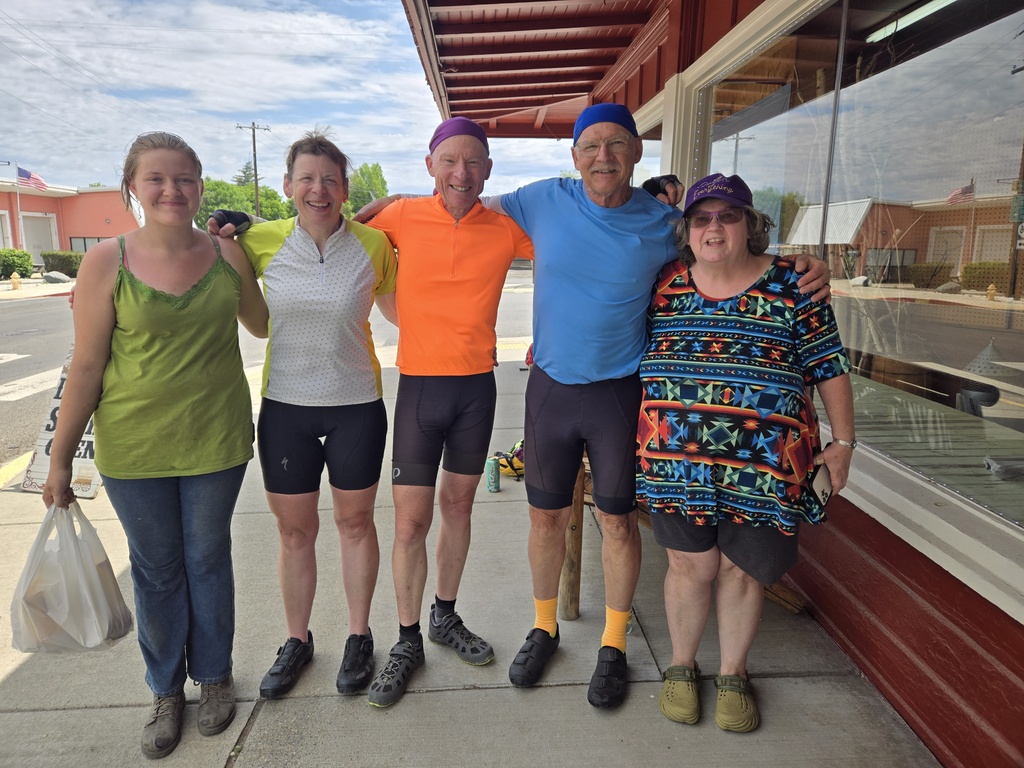 In Richland we had a mission – to meet up with a wonderful gal who we first met up in Dot Lake, Alaska.  Julie was the principal at the small school in Dot Lake where we stopped on a cold day in May 2017 at the beginning of our North-South America trip.  She and her band of kids warmly welcomed us, fed us delicious smoked salmon and provided warm showers and a safe place to set up our tent.  She now lives in Richland, Oregon, and we were passing right through on our route today.  We texted her from the grocery store on the main street and she came down with one of her kids, Kaylee, to meet us.  We had lots of fun reliving our Alaska meet up and hearing about all of her current projects – wow, she is one busy woman!!  She tried to give us a couple of jars of her precious canned salmon but we couldn’t really take the glass jars and we didn’t want to take any of her few remaining jars of salmon.  Thanks so much for coming out to meet us Julie – and good luck with your projects!