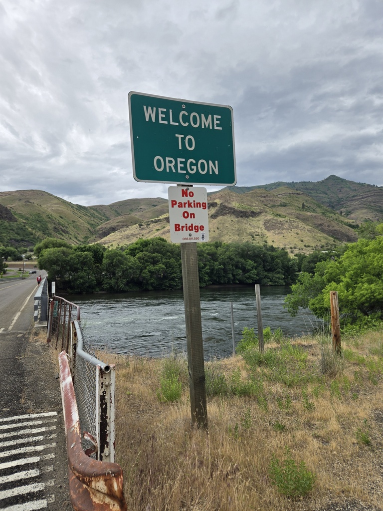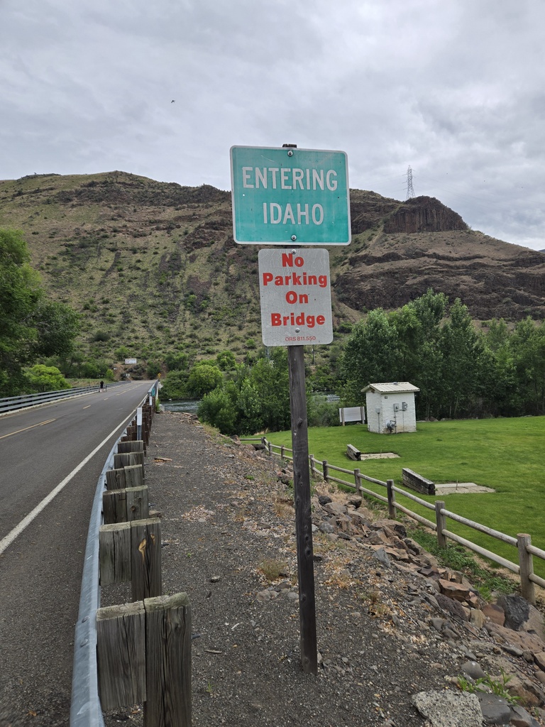 After dinner we walked across the Snake River bridge. This took us into Idaho and then back to Oregon when we walked back. Idaho seemed fine. We were only there for a minute so we did not adjust our watches. Tomorrow we will have to move our watches an hour ahead when we cross a different bridge some 5 miles upriver. The rain has blown through now, and the white noise from the nearby Snake River should mean a good sleep tonight.  And that would be a good thing, as we have a pretty decent climb tomorrow through Hell’s Canyon.  Chris is really looking forward to that…