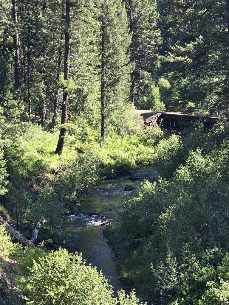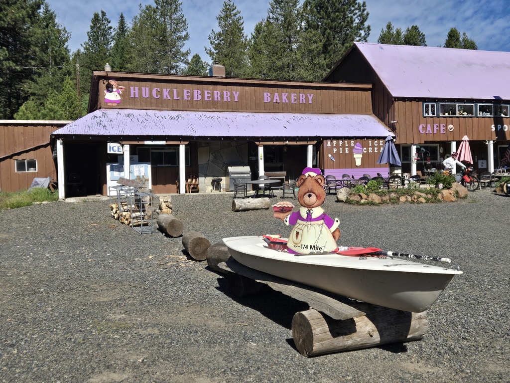 At 16 miles we stopped at the Huckleberry Bakery for a snack (how can you pass a bakery with huckleberry in its name). They were not open but the owner leaned out his upstairs residence and offered us cold water. We didn’t need to be asked twice. The water was nice but the free road advice was even more appreciated. He knew that we were on the Transamerica route and told us of a steep canyon with a narrow road that was coming up just after New Meadows. We made note – local knowledge.