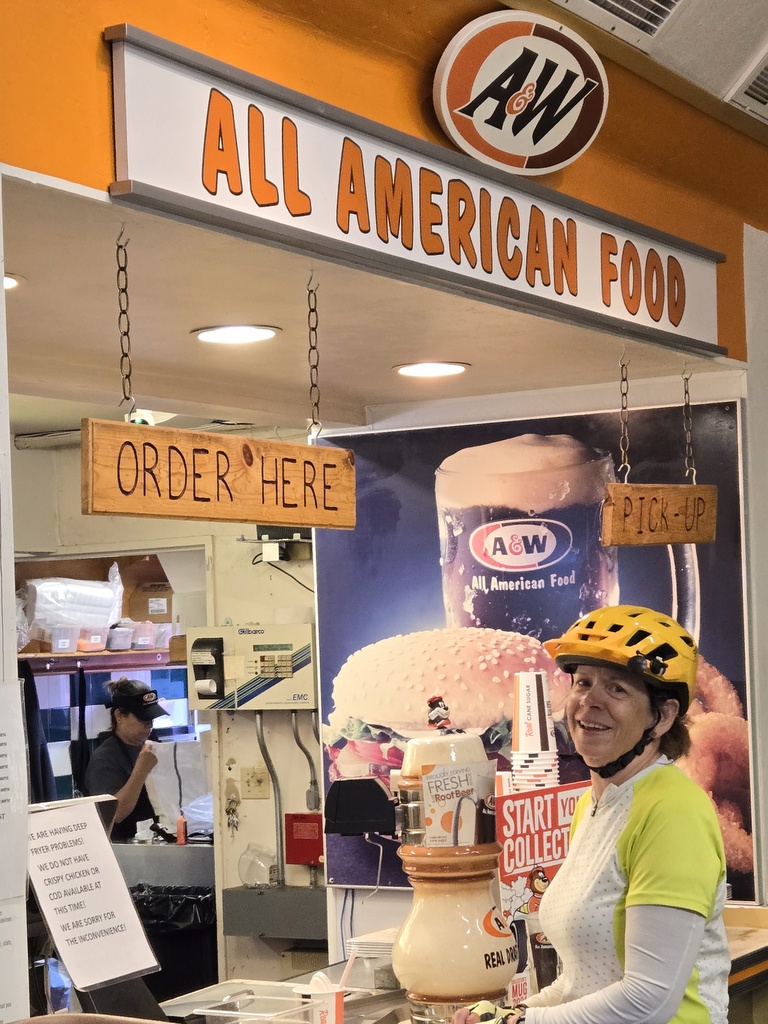 At 24 miles we reach New Meadows and pulled into a servo for an early lunch. The servo had, of all things, a mini A&W restaurant and grill. We had hotdogs, figuring they were safe. Chris had a burger, figuring it would be tasty. Both of us were correct. We even got a frosty A&W root beer – how can you pass that up?