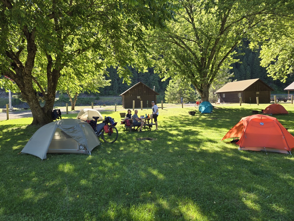Camp is nice, if not a little overpriced compared to previous camps. We are filling four of the tent sites, Chris from BC has one and the other two are filled by rafters. So, location does matter. All of us, including Chris from BC hit the onsite restaurant for dinner where Nancy and I both had the spaghetti special. They had very few other choices, which is something we think we’ll see more of as we head east. Tomorrow we head further up the Clearwater River towards Lolo Pass. Chris has negotiated us tent camping on the lawn of Lochas Lodge – should be a good day.