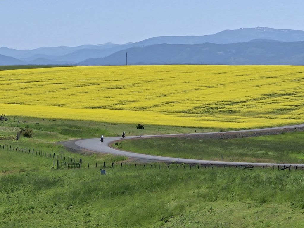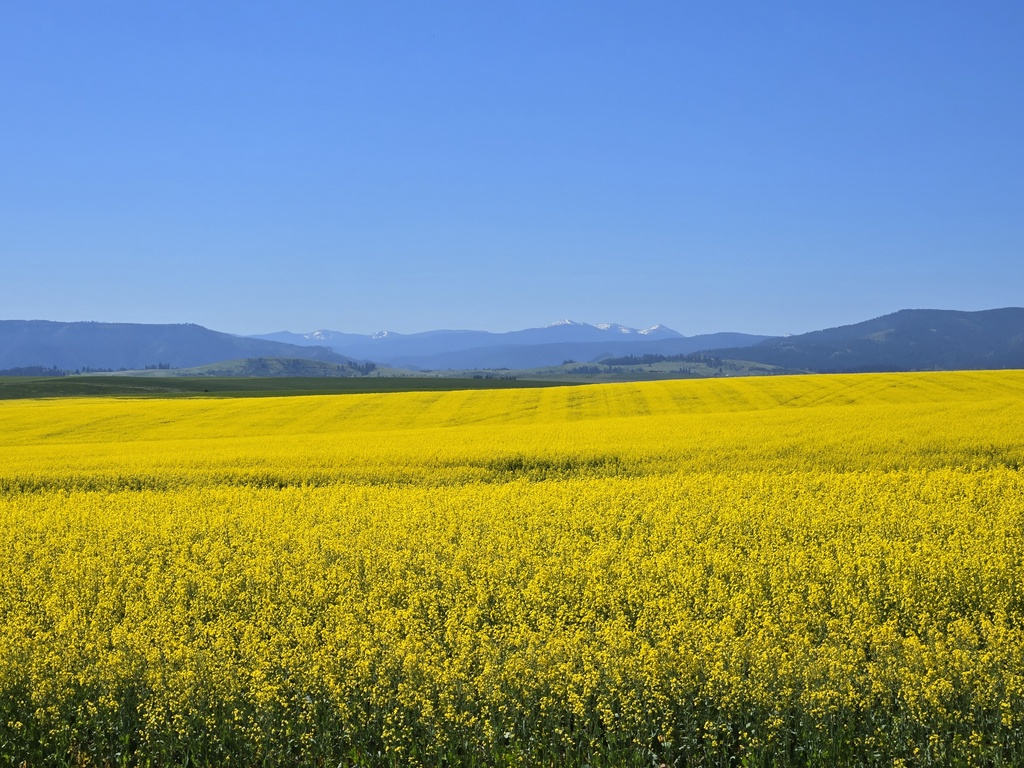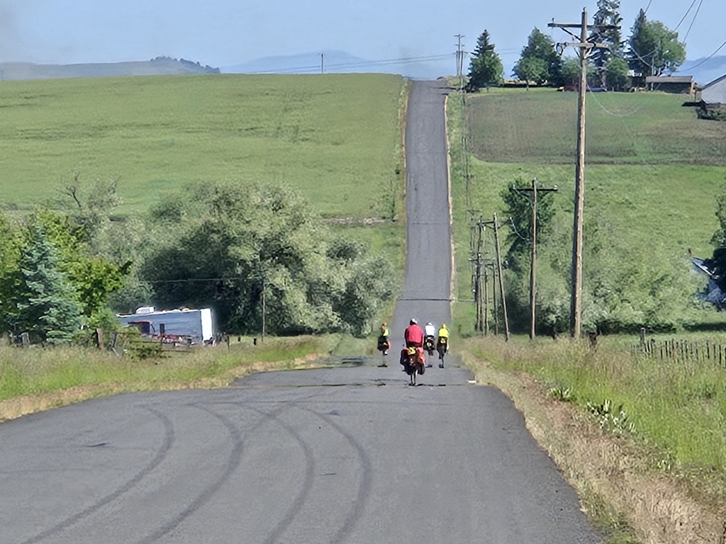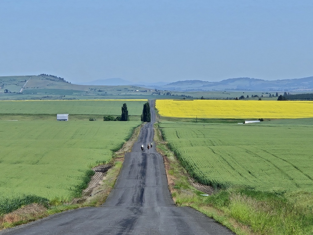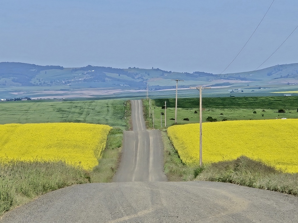We could have ridden out of Grangeville on Highway 13 but Komoot and Adventure cycling found us some nearly deserted back-paddock farm roads. The grasses and other crops were in full bloom. We think that the bright yellow fields were rapeseed but no one bothered to get out a phone and ask Google. Remember, today was supposed to be low technology, AI free. Regardless what plant it was, we enjoyed taking a lot photos as it was all very scenic.