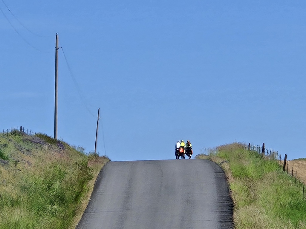 We could have ridden out of Grangeville on Highway 13 but Komoot and Adventure cycling found us some nearly deserted back-paddock farm roads. The grasses and other crops were in full bloom. We think that the bright yellow fields were rapeseed but no one bothered to get out a phone and ask Google. Remember, today was supposed to be low technology, AI free. Regardless what plant it was, we enjoyed taking a lot photos as it was all very scenic.
