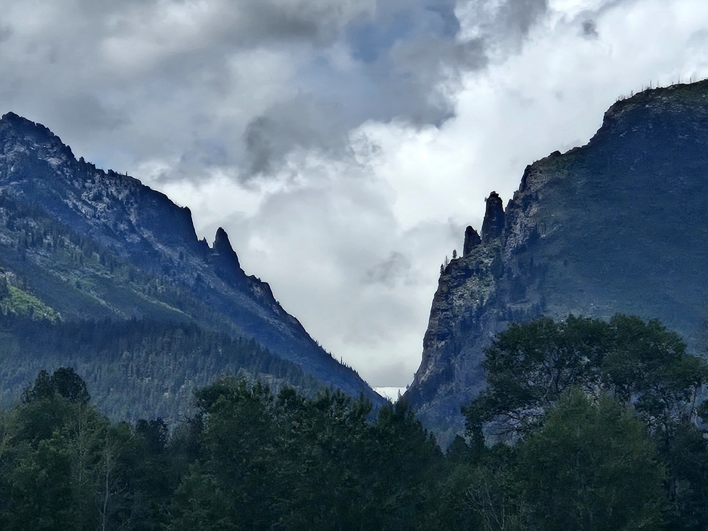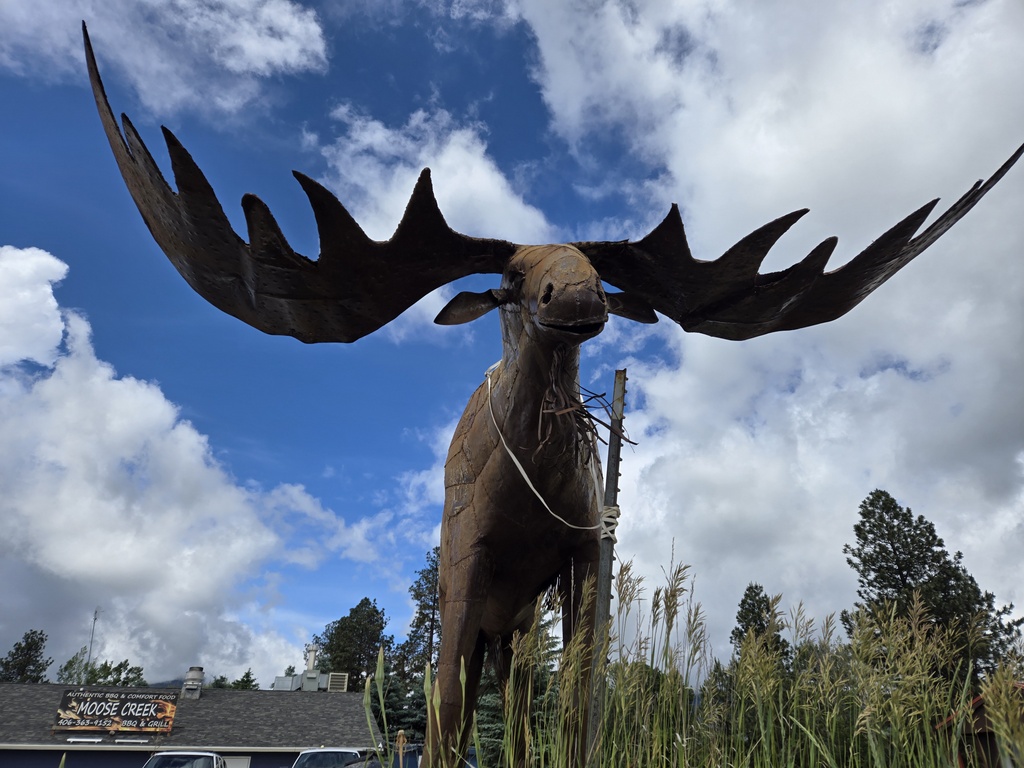 Everyone was sad this morning to leave our nice AirBnB in Missoula. We enjoyed a great location and very comfortable space, a perfect place to wait out yesterday’s rain and inclement weather. But the show must go on. We had a bunch of leftovers for brekkie, including meatloaf sandwiches and mashed potato cakes – yum. We delayed as much as we could to let the last of the morning rain stop and finally pulled away at 9:30. We were all moving slowly.