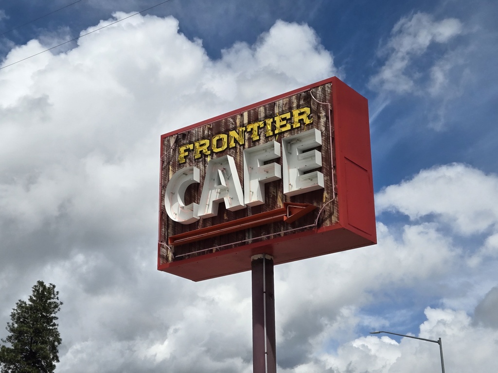 We had a couple stops out on the trail at port-o-potties and finally took lunch in Stevensville, at the Frontier Cafe. The cafe was one of those places where I don’t think they serve many cyclists. We were warmly welcomed by both staff and patrons. With the voices they said, “hello” and “welcome”; with their faces they said “what the heck is that, never seen that before, I’d better be polite, hello” – gave us all a good chuckle. One of the patrons came over to tell us his tails of riding in past lives and give us God’s blessing. He had a side pistol (Gloc) at his hip and a small revolver like pistol in a harness in the middle of his chest. I think he might have been right handed, just saying. Nancy and Peter later had a very friendly conversation with the owner of the cafe. He drives big cattle trucks and wanted to learn more about how his rig affected out bikes. It was a fun stop and we got some delicious split pea and ham soup.