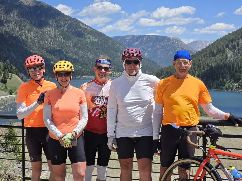 Eventually Chris, Nancy and I made the gradual left turn out of the valley towards Earthquake Lake. Almost like flicking a switch, we had a ripper tailwind. We dared not say anything out loud for fear it would change again. We flew along to Earthquake Lake and the memorial where we smiled at our good fortune and waited for Pete and Curtis. Before they could arrive, up drove Inge, Pete’s wife. Pete’s last day is today and she is here to pick him up. She’d already caught Curtis and Pete and taken their bags. After hugs all around, we too loaded most of our bags into her car – woohoo.