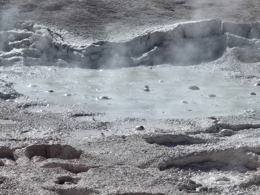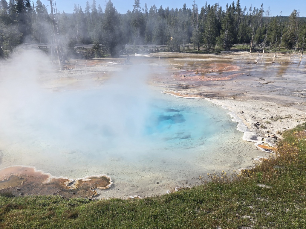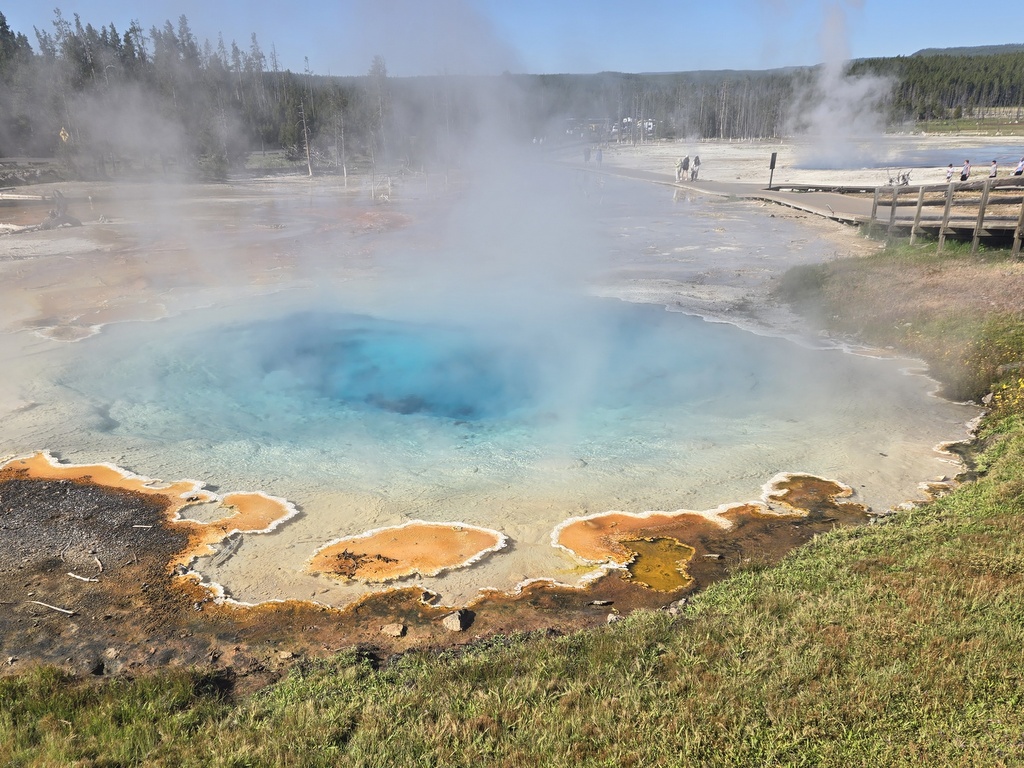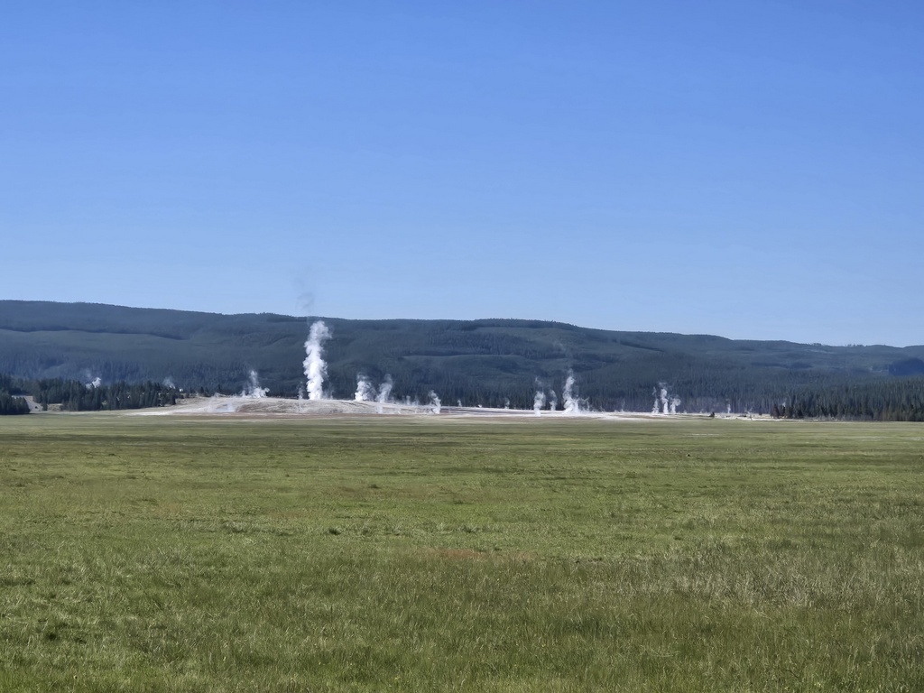 We took the Old Faithful route, which included a stop at the paint pots (the blue pool). Having seen it a couple of times, I stayed back to watch the bikes while the others walked the loop. I was entertained by the massive number of tourists walking by, people trying to get into the parking lot, and the general craziness of it all. The others came back excited by the view. And our luck continued – we made it to Old Faithful maybe 20 minutes before it erupted.