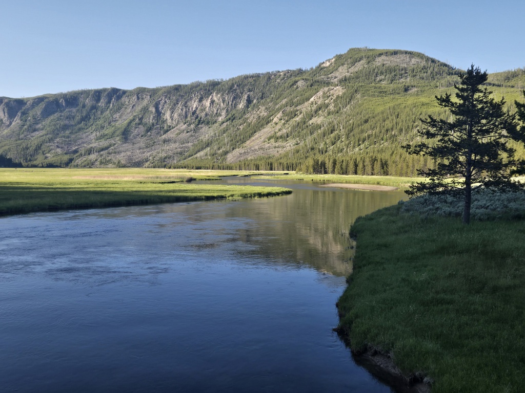 We headed into the park pleasantly surprised by the courtesy that most of the drivers showed us and a shoulder that varied between two and three feet. We thought that the first 14 miles would be boring. From a cyclists perspective it was amazing. The air felt great, the Madison River was beautiful, the flowers were out and we saw our first wildlife: elk, followed later by a baby buffalo, which put Curtis into tourist mode. That is, take every pullout, stop on short notice and snap pictures.