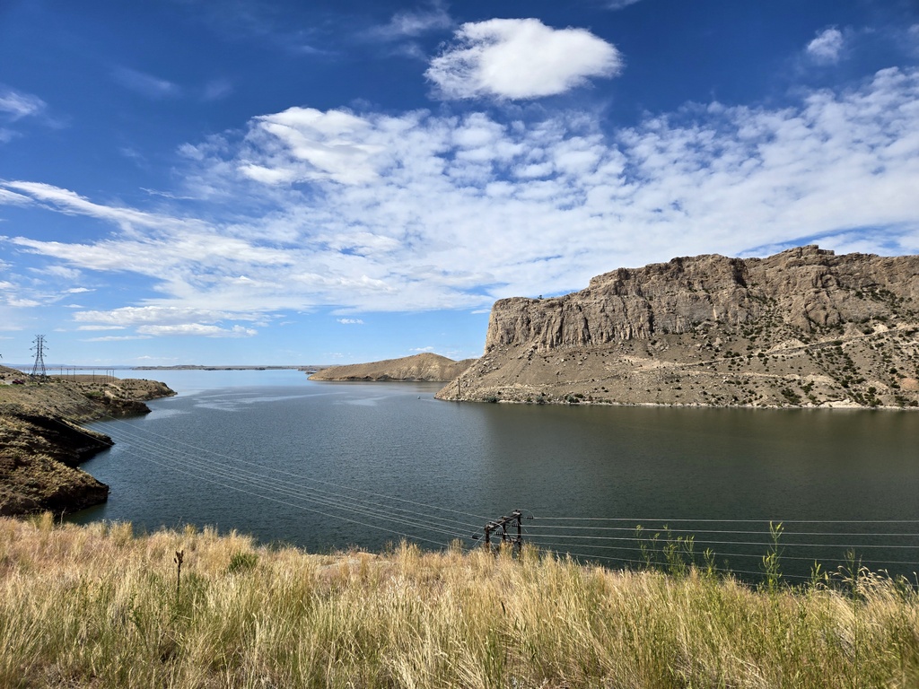 At the end of the canyon lies the Boysen Dam and behind it the Boysen Reservoir.  The reservoir is pretty large and there were lots of boats out on the water.  There were camping areas around the reservoir, utilized mostly by campers and fifth-wheels.  It would be a difficult place to camp in a tent, as there was nary a tree to be seen, so no shade whatsoever and no protection from the wind. The scenery completely changes at the end of the canyon, and all you can see for miles is dry, wind-swept land on either side of the reservoir.