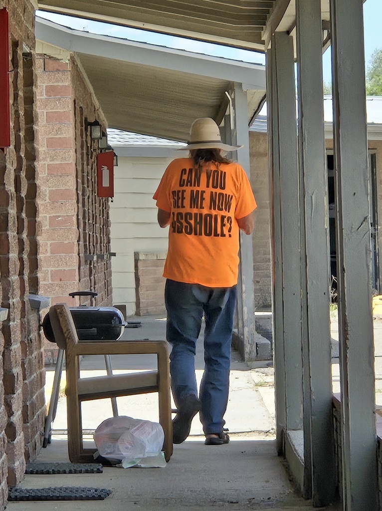 This guy befriended Curtis. He rode a motortrike and I think the shirt was to make a point to car drivers. He came back later, after smoking a joint that we could smell but without his shirt on this time. Curtis again took it for the team and chatted politely.