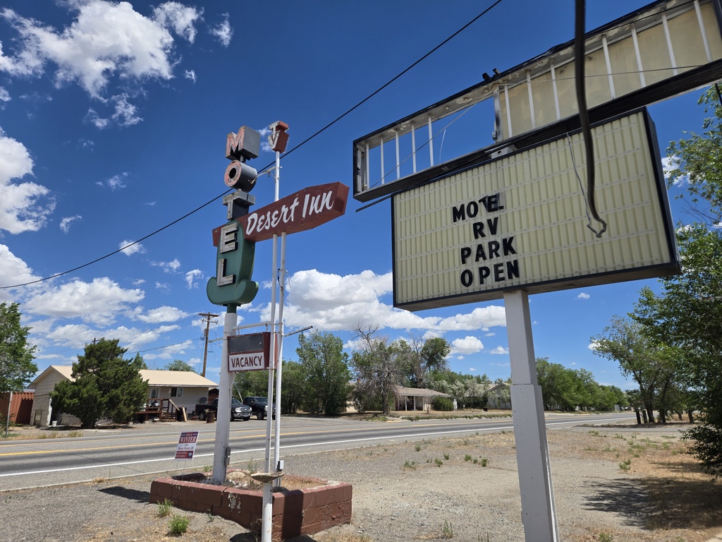 After killing some time at the truck stop we headed to the hotel that I had booked – the slightly oddly named Love Hotels Desert Inn (it is literally the only hotel in Shoshoni).  We rode down the road in the direction of where it showed up on Google maps, and we seemed to be heading out of town.  I told Dave I thought we were on the wrong street, but no, sure enough there was a sign across the street in front of a place that looked a little (a lot) worse for wear.  Hmm, this might be bad, I thought…  Really, the sign was barely standing upright, the parking lot seemed to be losing its battle with tumbleweeds, and there were a couple of odd-looking characters hanging out near some of the rooms.
