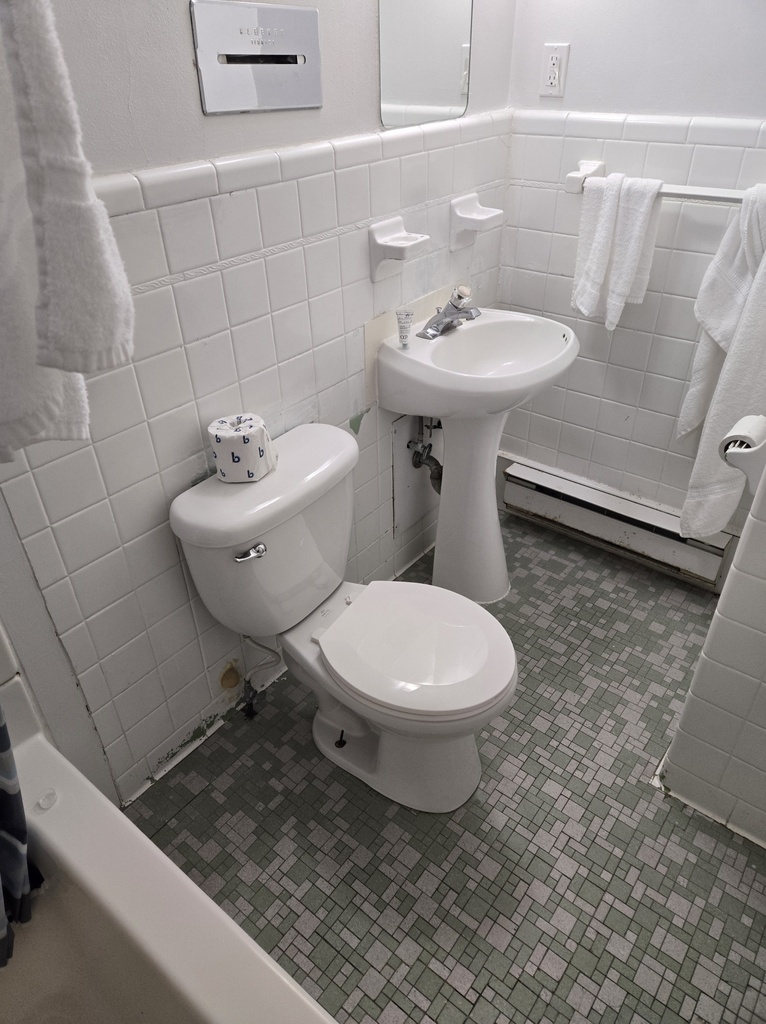 Looks nice, isn’t. At one point they painted the tile green. Now most of the paint has been scraped off (most). Mold in corners is one reason Nancy told me it’s shoes on when in the room, no exceptions.