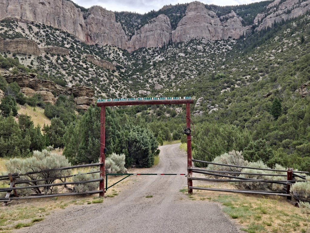 There were quite a few folks fishing in the river, both in boats and standing on the banks. I think fly fishing is a big tourist draw here – lots of fishing guides advertised, as well as little cabins along the narrow strips of land next to the river.  There were even a few ranch gates with big arches, though it was difficult to see where these led, given the high rock walls.