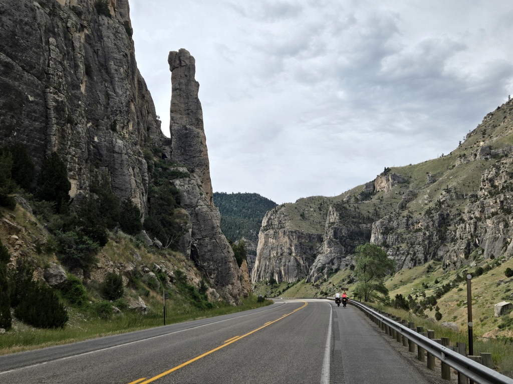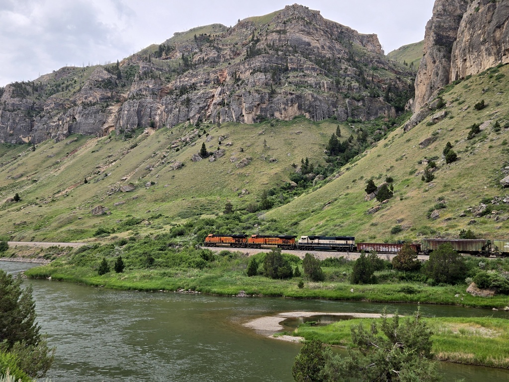 Shortly after we left town we headed into the Wind River Canyon, through which the Bighorn River runs.  The canyon is quite narrow, with the road on one side of the river and a train track on the other side.  All kinds of different rock formations line the walls, which are steep enough to give you vertigo if you look up at them from the road. There were several signs that identified certain rock formations and provided timelines – most were aged 185 million to 600 million years old.  So, some pretty old rocks out here in Wyoming!  It was a very scenic ride, and the train coming down the other side showed us just how the noise echoed through the canyon.