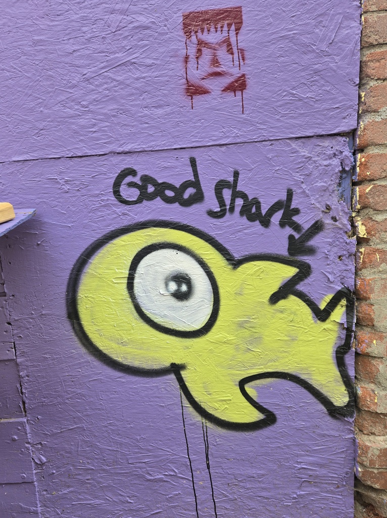 Congratulations on 2 100 mile days in a week! You deserve a good rest day! I hope the scenery gets a bit better soon. The art is great, both on the road and back alley.