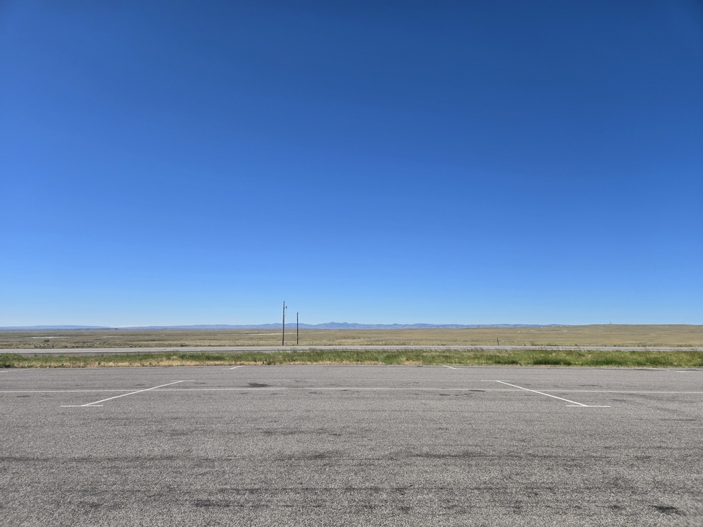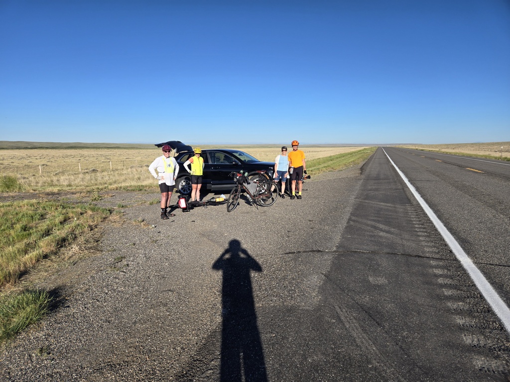 We made three other stops on the road. The first one was at the rest area where we had planned to get water. The rest area looked great in the WYDOT online images but much worse in person. They are working on the toilet blocks, had port-to-potties and no potable water (thanks again for bringing water Cindi). The second stop was at Hell’s Half Acre, a 320-acre geologic oddity that is composed of deep ravines, caves, rock formations and hard-packed eroded earth. You can’t see much from the road but we stopped anyway. The last stop was to change a rear flat tire on my bike. I ran over a screw and lost air quickly. Having no bags on the bike made the change fast. There was quite a bit of debris on the road today, including screws and lots of bolts. We all wondered whether the stray bolts ever had an impact on the trailers, trucks or cars from which they went missing.