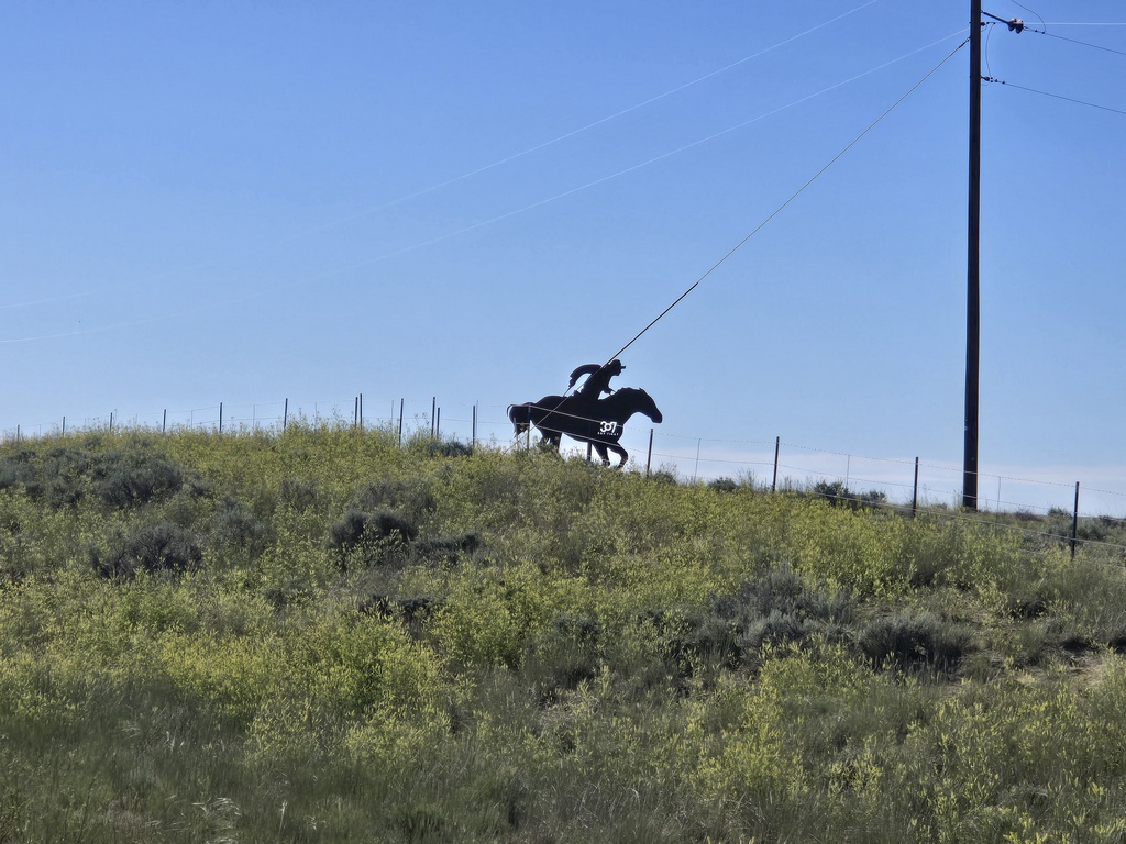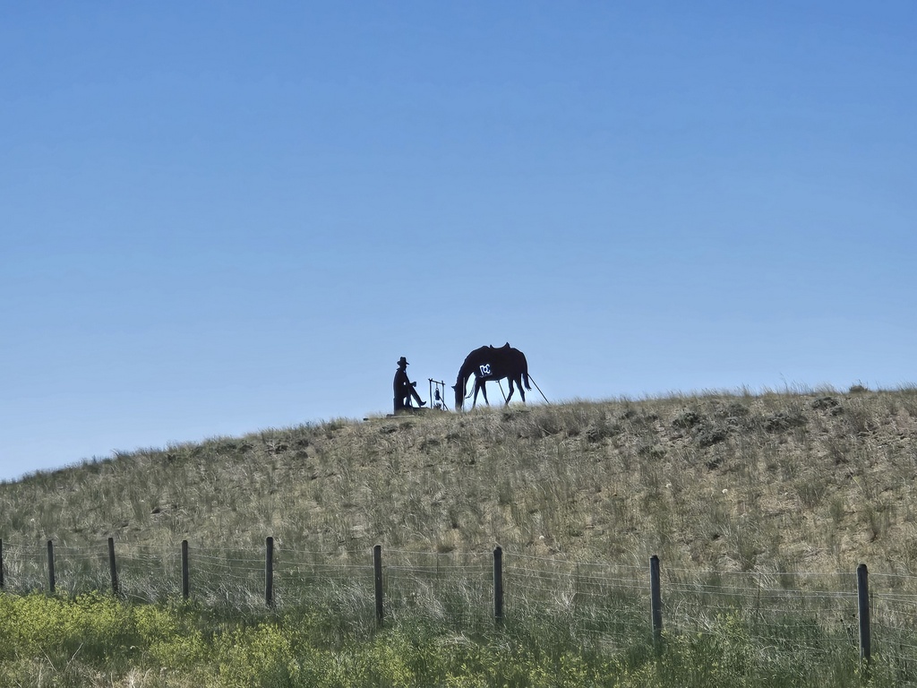 I was told yesterday by my senior editor that I didn’t need to stop for photos today because I had already taken lots of photos of the Wyoming grass and nothingness. In other words, “it’s a long day Dave, don’t go stopping all the time or we’ll never get there.” Well, Nancy was right, there was very little of anything that merited stopping today. We saw a few antelope, including some young ones but they scattered when they saw us so no photo stops there. We had some nice “cowboy silhouette art” made by the good folks at 370first.com that merited a stop or two. I didn’t stop at all of them and the gang slowed for me to catch back on for the ones I did stop at. Thanks teammates!