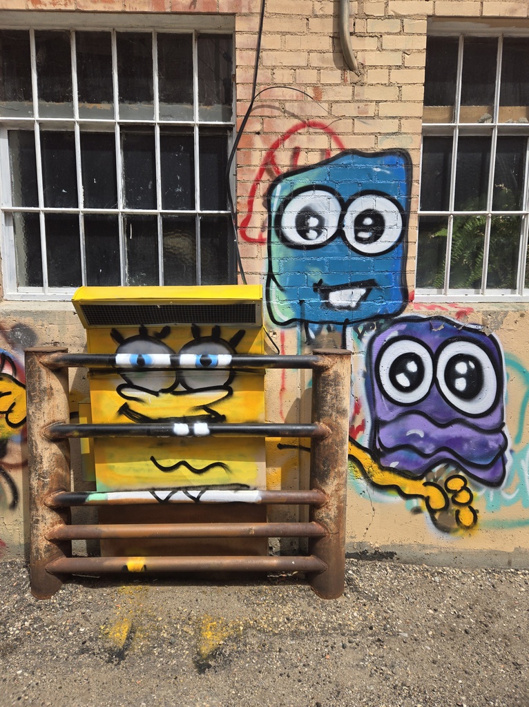 Congratulations on 2 100 mile days in a week! You deserve a good rest day! I hope the scenery gets a bit better soon. The art is great, both on the road and back alley.
