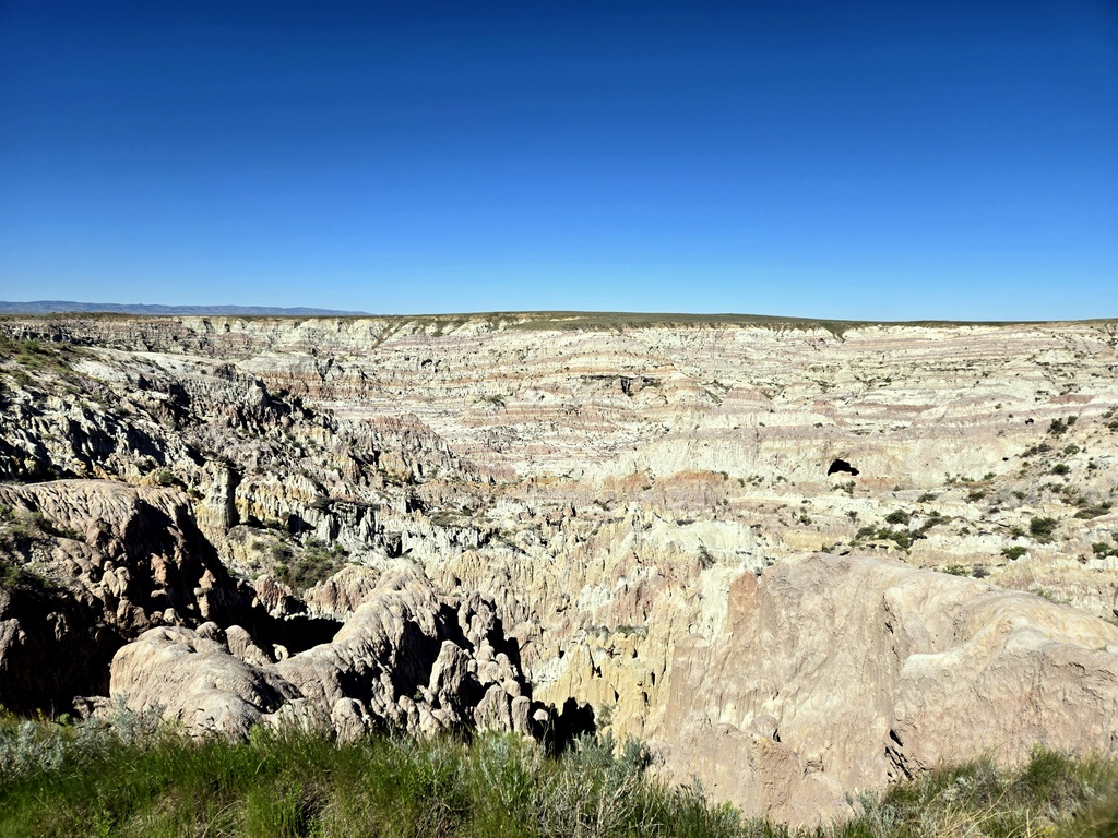 We made three other stops on the road. The first one was at the rest area where we had planned to get water. The rest area looked great in the WYDOT online images but much worse in person. They are working on the toilet blocks, had port-to-potties and no potable water (thanks again for bringing water Cindi). The second stop was at Hell’s Half Acre, a 320-acre geologic oddity that is composed of deep ravines, caves, rock formations and hard-packed eroded earth. You can’t see much from the road but we stopped anyway. The last stop was to change a rear flat tire on my bike. I ran over a screw and lost air quickly. Having no bags on the bike made the change fast. There was quite a bit of debris on the road today, including screws and lots of bolts. We all wondered whether the stray bolts ever had an impact on the trailers, trucks or cars from which they went missing.