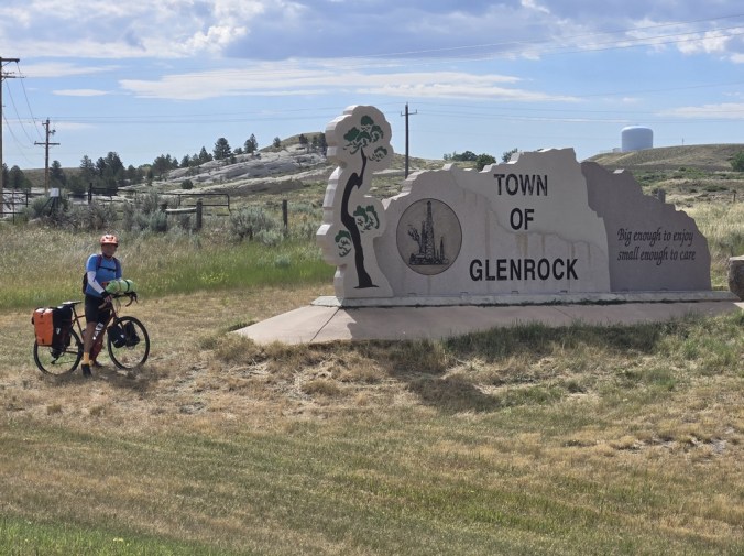 Twenty-six miles from Casper we reached Glenrock. Dave, Nancy, and I found Glenrock to be bigger than we expected. Chris, of course, had been there the day before with his family and knew right where to direct us for a water and bathroom break at the city water park. Unfortunately the navigation direction wasn’t clear to everyone and resulted in me pointing Nancy to a port-a-potty a block off. I’m sure Nancy would have preferred to frequent the water park facilities because judging by the outside the town takes some pride in their water park. Next time we are in Glenrock, WY we will know where to stop!