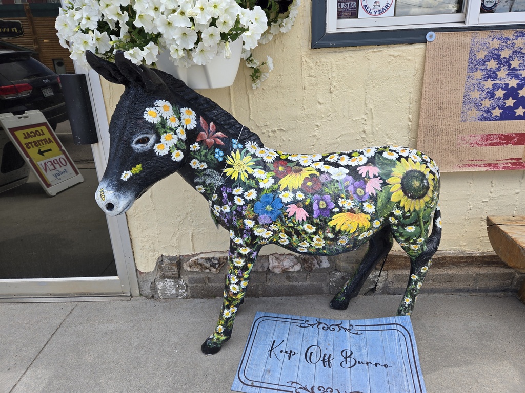 We saw a few other riders on the trail but didn’t get a chance to talk with anyone. Nearing Custer, there were a few more folks on e-bikes, we suspect that they may rent them here. Other riders had complained about un-skilled e-bike riders going too fast but we found all the other trail users more than polite. Tomorrow we have about 12 more miles of the trail to ride first thing in the morning.