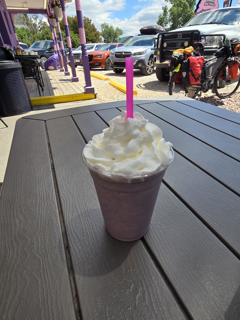 When we arrived in Custer, the first shop we saw was a broiled chicken drive-thru shop. Curtis couldn’t resist and bough a 4 piece chicken set. Chris, not to be outdone by Curtis bought an 8 piece chicken set. Nancy and I rode on to the pie shop where I had pie and Nancy had a huckleberry milkshake. When the boys arrived Curtis ate all of his chicken (and jo-jos). Chris looked a little shocked at how much chicken he had purchased and agreed to save half of if for chicken burritos for dinner tonight.