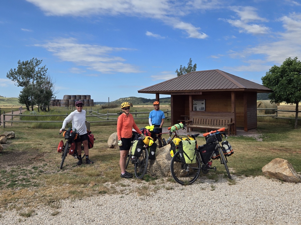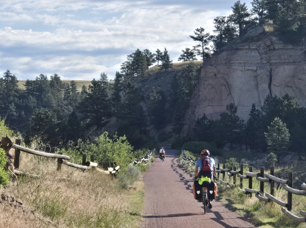 Today we got off the highway and rode the George S. Mickelson rail trail. Rail trails are found throughout the USA. They are mostly disused rail lines that have had rails and ties removed. Some are pretty rough, think big gravel or washboards. Some are have been paved and are perfectly smooth. The Mickelson trail is surface is primarily crushed limestone and gravel. We rode 46 miles on the Mickelson today and found the surface to nearly perfect. It was great fun being away from traffic and not having to call out “car back” every time a vehicle overtook us. The gravel is undoubtedly slower than riding the asphalt but the direction that we rode had nearly constant 1-2% uphill grades so our speed was already somewhat lower. The gravel made little difference.