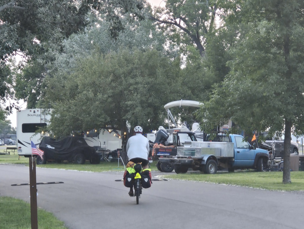 It was quite hot sleeping alongside the Missouri River last night. All of us left out tent flies open and more or less slept without being under our sleeping bags. Forecast for the next few days is hot and it was warm today but really a persistent head/side wind was more an issue than the heat.