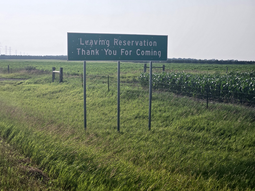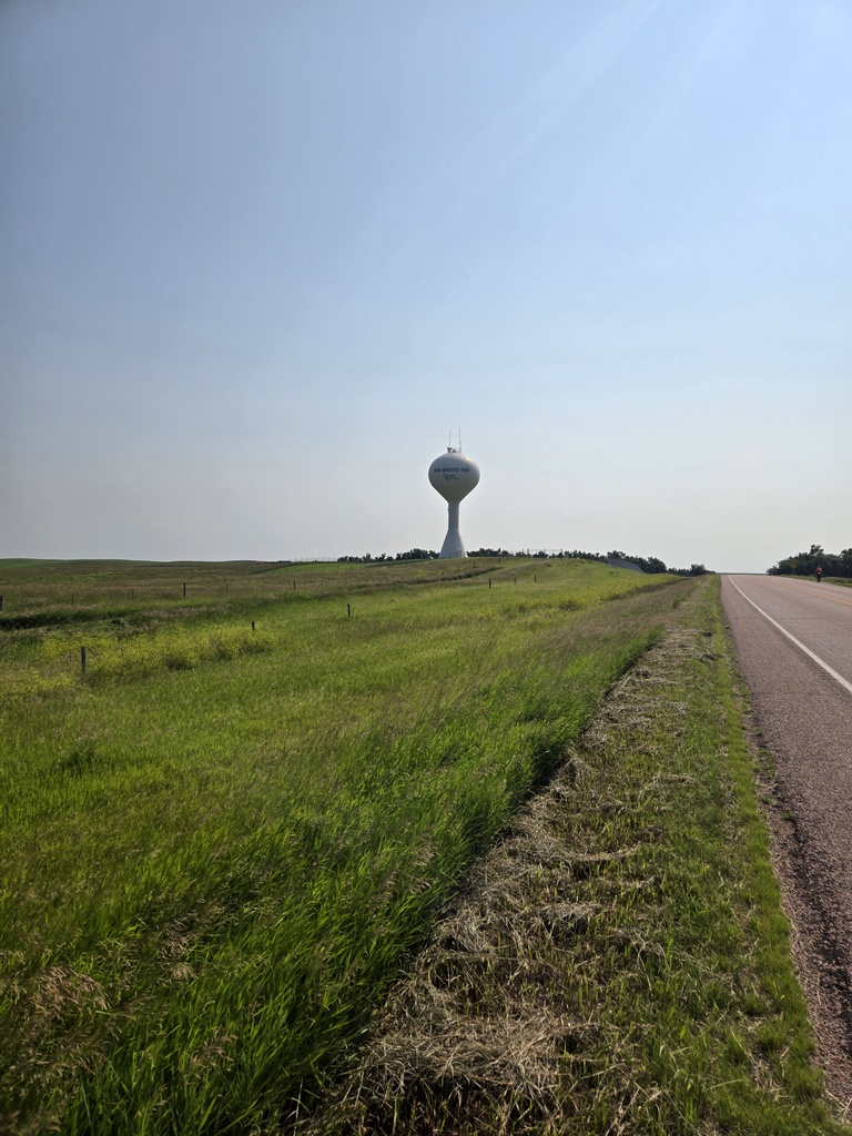 We couldn’t really leave much before 6:45 because it was only 3 miles to the Ft Thompson mini-mart and they don’t open until 7AM. We were sure to not find any sort of snack stop on the road until the 47 mile mark so we picked up a couple ready-made brekkie sandwiches to get us through the morning. We rode out of Fort Thompson on Highway 34 and boy what a slog it turned out to be. At the Missouri River we left “West River” and entered “East River”. We’d been told that East River was flat and that the hills ended at the river. Well, I am here today to report that the hills don’t end at the river. East River became much flatter after we completed the 47 miles to Wessington Springs. Before that it was one continuous set of “one mile down, one mile up” hills. Add to this a nice cross wind from the north and it made for slow riding.