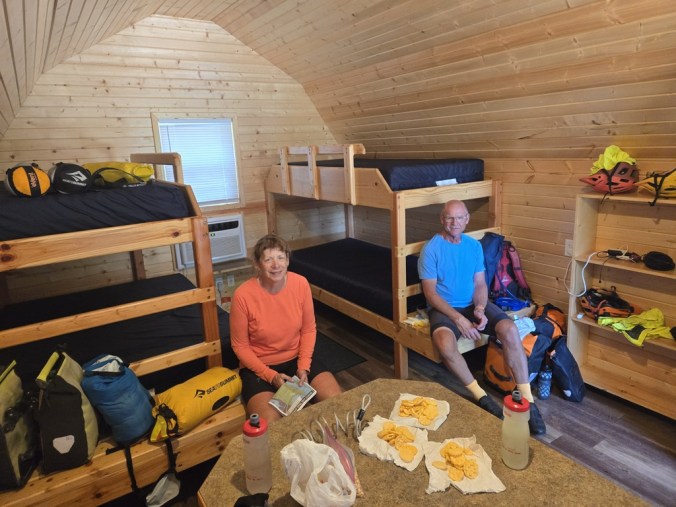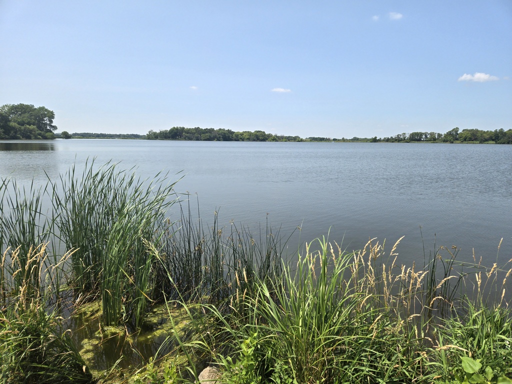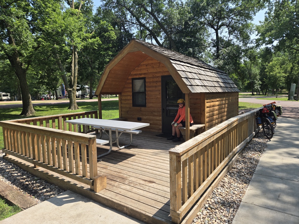 It wasn’t until the last few miles that the sameness farm scene gave way to trees and lakes. We rolled into the Oakwood Lake State Park and it was so green and so blue (the water that is). We had prearranged to stay in a dry cabin at the park. It’s larger than our last dry cabin and actually pretty nice. It has AC and bug screens so we won’t have to deal with mossies at a camp site. There enough beds in the cabin for Pete and Curtis to join us but I don’t see that happening so we’ll just spread our gear out. At first the park ranger gave us the cabin furthest from the amenities block but we managed to get moved into a much closer ADA cabin. None of our crew was keen to have to walk ½ a mile to use find a bathroom at night.