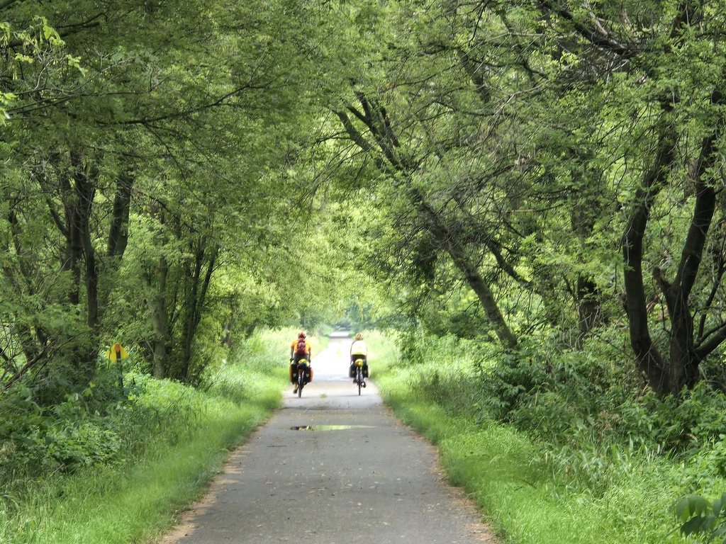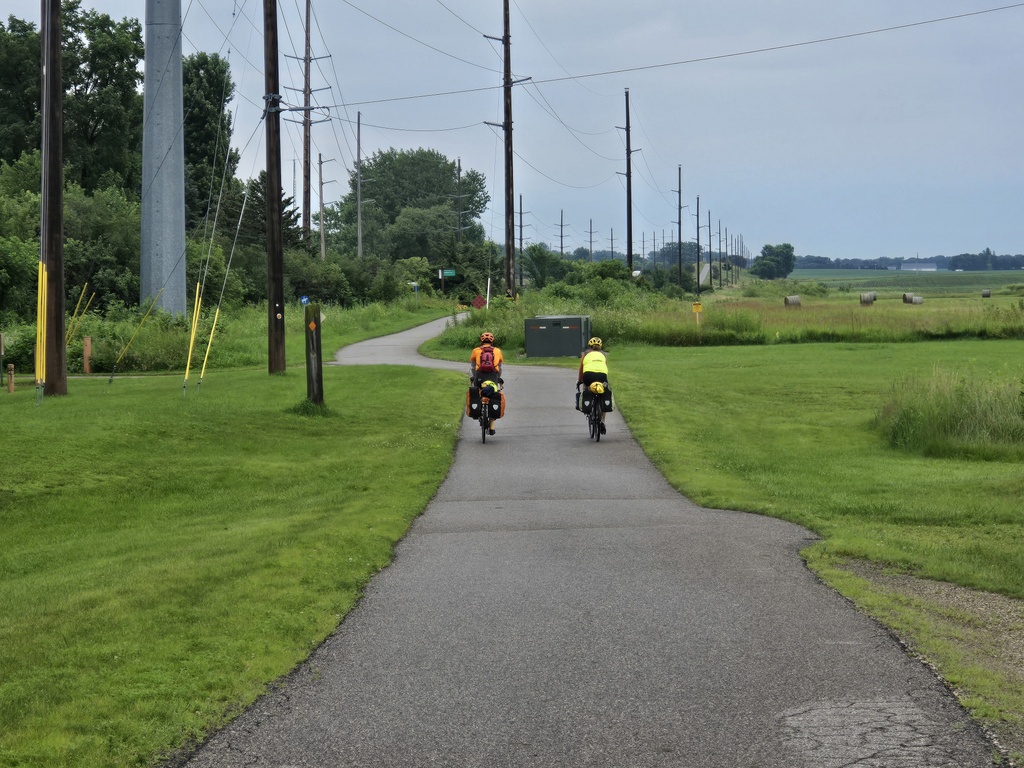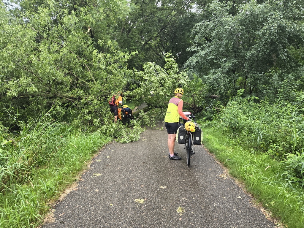 Right at the hotel we hopped on our first cycleway of the day, The Luce Trail. During the day we were on a few roads but mostly cycleways all the way into the city. The early paths were all sealed so we only had to deal with a few puddles and a little wet pathway. Later in the day some of the paths were crushed limestone giving us more mud and dirt than we wanted on our nice clean bikes. We came across one completely flooded underpass that we could route around. On the Luce path we came across a tree that had clearly blown down in the storm overnight. It took some teamwork and grunting but we were able to lift the bikes over and through it without too much trouble. Early on in the wetter parts of the day, the biggest drama was the number of mozzies that swarmed us whenever we stopped. Late in the day the drama became constructions projects and lots of detours. It seems like much of the city is in a re-building phase. Construction and detour = stop and get out the phone to double check everything. Navigation in a big city is not quite the same as the open prairie where you stay on the same highway day after day.