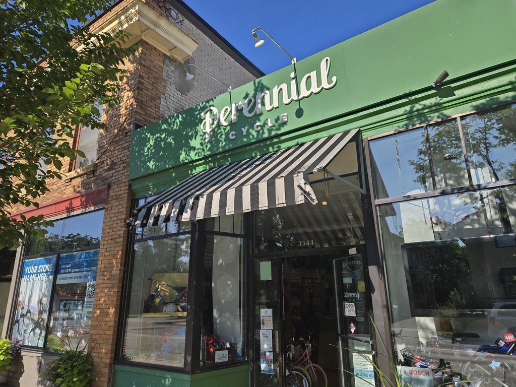 I’ve previously done some shopping at an online bike shop called Perennial Cycles. I shopped there for small bits I needed to wire our SON dyno hubs up for lights and batteries, plus a few other hard to find small parts. I’d never really given a second thought about where Perennial Cycles was located because I was focused mostly on finding unique parts that they happened to carried and I just filled out the order form. To my surprise when Chris started looking for bike shops, he mentioned that the closet one was none other than Perennial – only .7 miles away. How could I not swing by their shop? We visited them this morning, found a few small parts and generally geeked out talking about bicycle lighting systems (or at least I did, not sure that Nancy was quite as interested as I was).