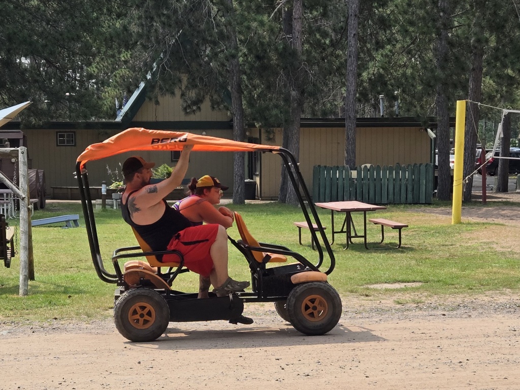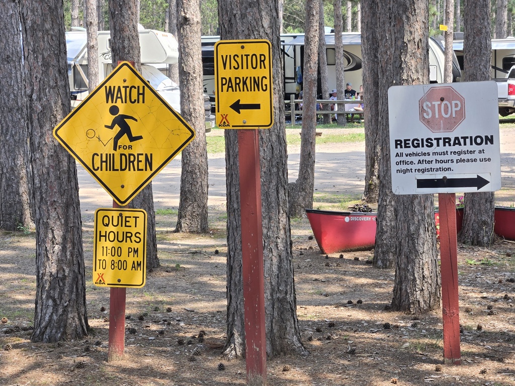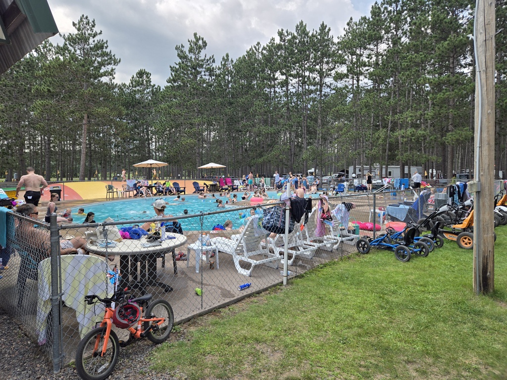 I could simply write that we are staying at the Hayward KOA tonight and leave it at that. It would be easier as well as I don’t think I am a good enough writer to be able to capture the hoards of people who have descended on the 250 site camping and summer fun hotspot that the Hayward KOA is. The campground has a pool, a water slide, cornhole boards, horseshoe pits, tether ball courts, 3 play grounds, 2 game rooms, 100s of pedal around camp 4 person bike carts, a beach volleyball court and way, way more. Other than our site, which will house only three people, most sites have what seems like tens of adults and just as many children. Our little camp tents are could be set-up inside just about every other tent in the park.