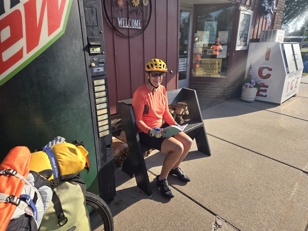 After about 14 miles, we stopped for drinks in the small berg of Haugen, right where Wisconsin’s Ice Age hiking trail crosses the Adventure Cycling route. The Ice Age Trail is a 1,200 mile walking trail that sort of loops all over Wisconsin. The village grocery in Haugen has a log book that they ask both hikers and cross country rides to sign. Naturally the Chris Crossing team was happy to add our names to the honour roll.