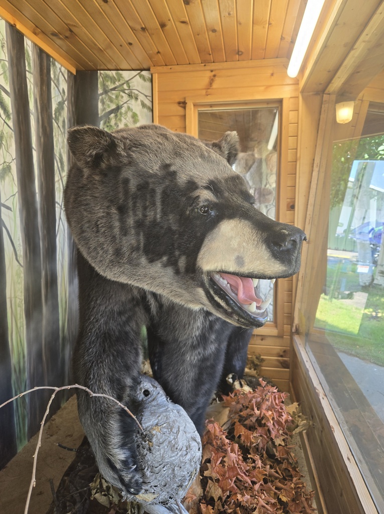 We arrived in Glidden shortly after noon, stopped by Mac’s Place for a quick bite to eat. Mac’s is described as “two doors down.” You might ask, two doors down from what? It turns out it is two doors down from the Glidden bear, a 665 lb word-record stuffed bear that was shot in 1963. The preserved bear is now housed in a glass case in front of the community center, with all the details of his demise noted on plaque in the window.