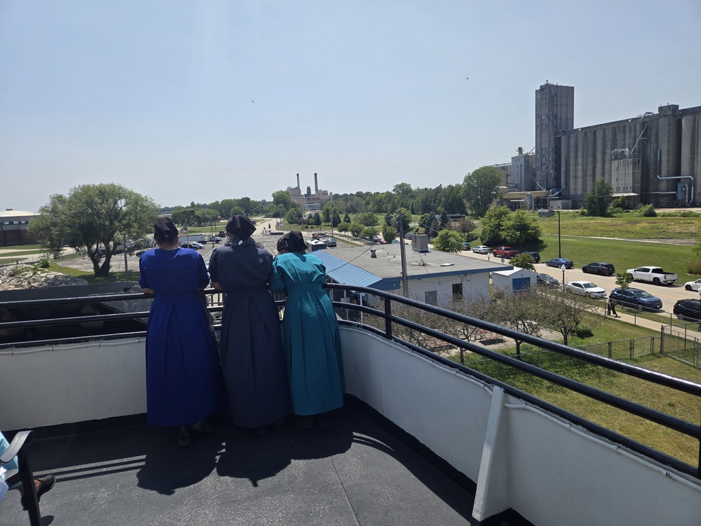 Amish gals overlooking Manitowoc from ferry