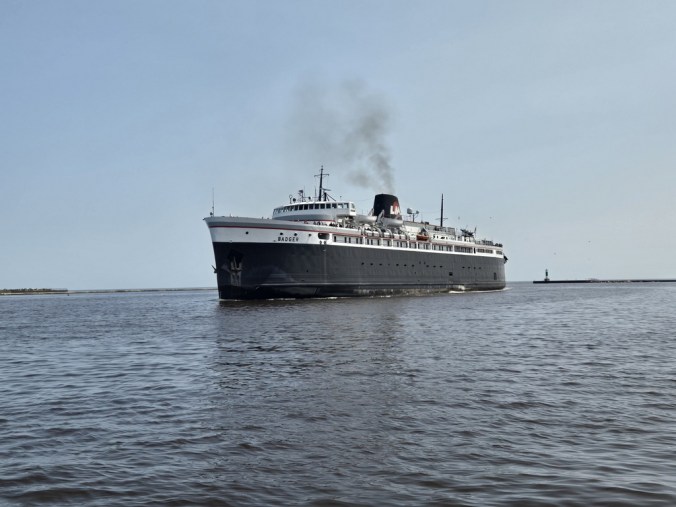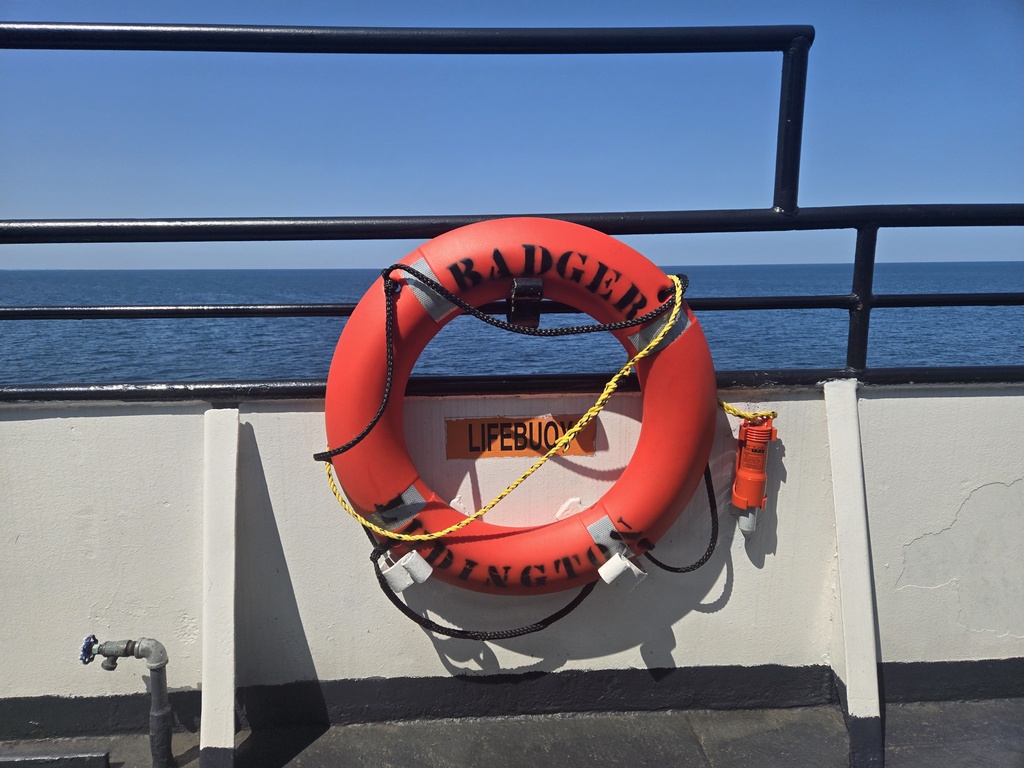 I’ve been tasked with writing about the ferry experience. The SS Badger is one of only 2 mobile National Historic Landmarks. It was launched in 1953, can carry up to 600 passengers and 180 vehicles (including RVs and trucks) and does about 450 crossings each year between May and October. It is the last coal fired steam ferry still in action. We boarded in Manitowoc, Wisconsin, took off at 2, lost an hour a somewhere in the middle of the lake, and landed in Ludington, Michigan just at 7pm, Eastern time.